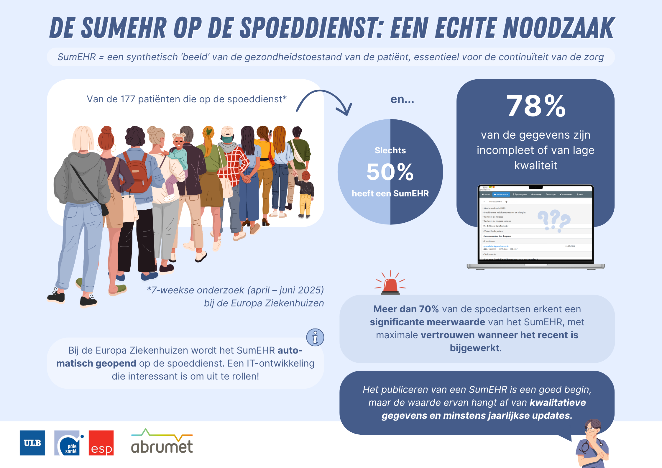 In het kader van een academische samenwerking met de Ecole de Santé Publique (ULB) heeft Abrumet bijgedragen aan een enquete over het gebruik van het SumEHR op de spoeddienst. Deze enquête, uitgevoerd in de Europa Ziekenhuizen, biedt ons vandaag waardevolle inzichten…